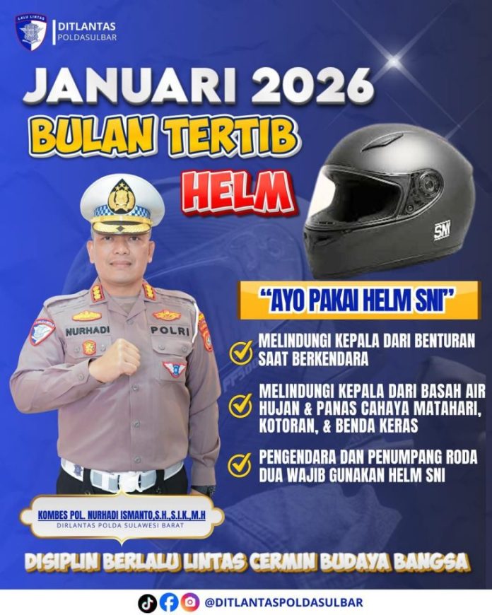 METROSULBAR  –Bulan Januari 2026 resmi ditetapkan sebagai “Bulan Tertib Helm” oleh Direktorat Lalu Lintas Polda Sulawesi Barat, sebagai wujud komitmen meningkatkan kesadaran dan kepatuhan masyarakat terhadap keselamatan berlalu lintas, khususnya bagi pengguna roda dua.