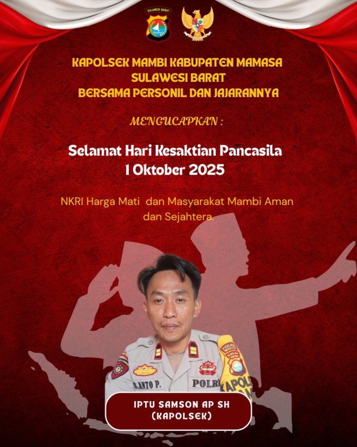 DAERAHMAMASANEWS Kapolsek Mambi Kabupaten Mamasa Bersama Personil Dan Jajarannya Mengucapkan Selamat Hari Kesaktian Pancasila 1 Oktober 2025* Penulis MetroSulbar - Oktober 1, 2025 0 53 FacebookTwitterPinterestWhatsApp Kapolsek Mambi Kabupaten Mamasa Bersama Personil Dan Jajarannya Mengucapkan Selamat Hari kesaktian Pancasila 1 Oktober 2025